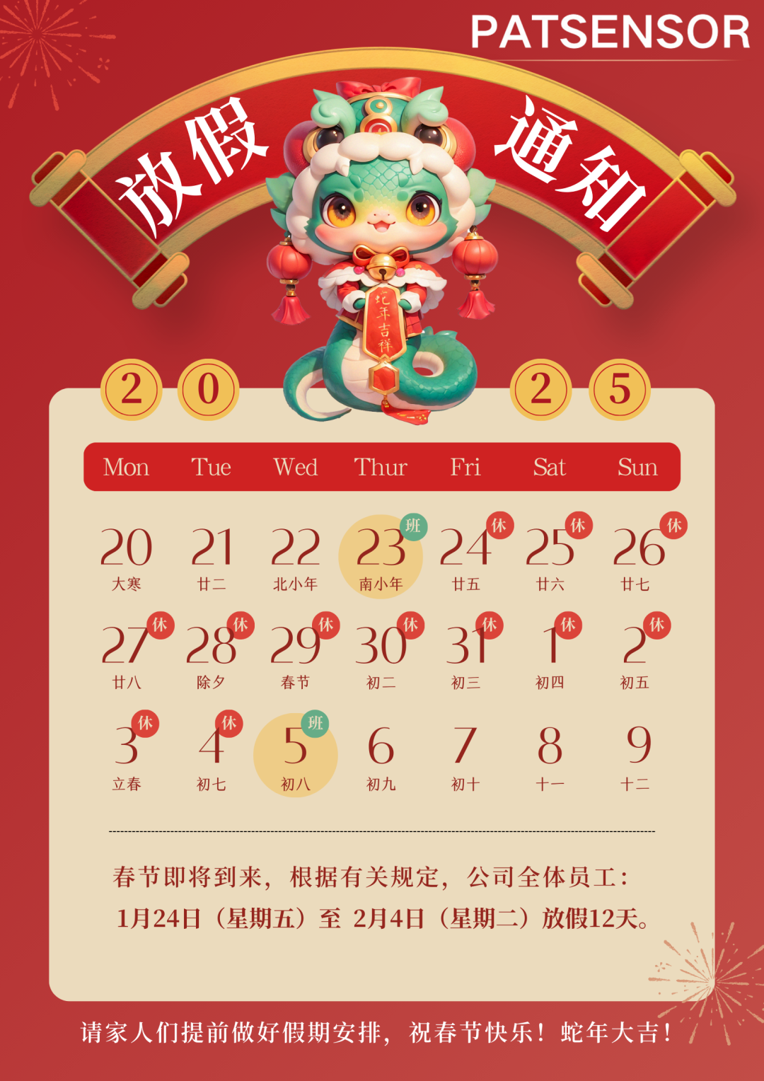 在這個充滿希望與喜悅的時刻,我們?yōu)槟蜕献钫\摯的祝福:愿您在新的一年里,生活如春花般絢爛,幸福如蜜糖般甜美,事業(yè)如旭日般蒸蒸日上,健康如青山般常伴左右!新的一年,愿我們繼續(xù)攜手同行,共同迎接更多美好與驚喜!派特傳感祝您和家人新春快樂,闔家幸福,萬事如意!