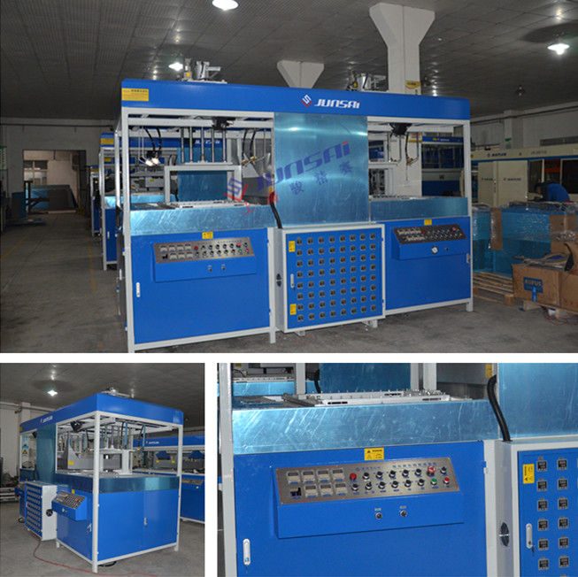 4. 把整板模具排放在下模腔內(nèi),四周密封,四周密封,再把“壓片”手動(dòng)閥至升起位置,準(zhǔn)備上料,把膠片拉過(guò)壓片位開關(guān)閉“壓片”手動(dòng)閥,使壓片框壓住膠片,調(diào)好加熱時(shí)間,后用手拉動(dòng)電爐至工作位置,進(jìn)行加熱,觀察加熱狀態(tài)下的膠片,調(diào)整加熱時(shí)間,使之在佳狀態(tài)下做出好產(chǎn)品,加熱完后,即開始報(bào)警,(如加熱不夠可進(jìn)行二次加熱),把電爐推向空位或二???,一模下模上升到位,馬上扭去吧真空扭制,噴水開關(guān)。成型后下模下降壓框升起,把產(chǎn)品拉出,壓框下壓。整個(gè)過(guò)程完成后,二模馬上又可以操作,調(diào)整好時(shí)間制后,兩個(gè)??蚣纯蓙?lái)回半自動(dòng)生產(chǎn)。