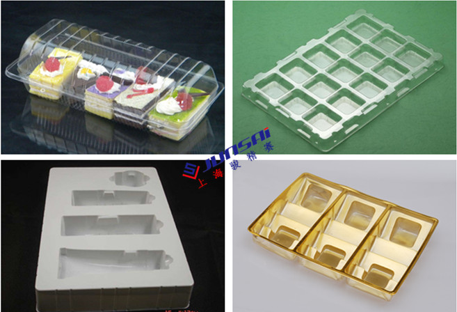 主要適用于PS、HIPS、PVC、PET、PP等塑料片材成型,生產(chǎn)各種盒、碟、托盤、碗、蓋等包裝制品。如:食品盒、蛋糕盒、快餐盒、糕點托盤、超市托盤、醫(yī)藥針劑托盤、口服液托盤.等